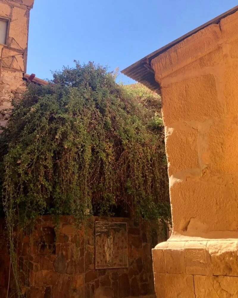 …une fois le portail passé j’arrive dans ce qui pourrait être un petit village. Ali me précède, il me fait signe de tourner sur ma gauche puis il me montre un gigantesque buisson. Il est composé de ronces, de plantes grimpantes d’un vert tendre. Il mesure plusieurs mètres de hauteur. « Voici le buisson ardent ». Je suis bien sur béate devant la symbolique de ce mûrier sauvage mais je lui demande si nous sommes certain que ce buisson prend ses racines dans celui de Moïse ? La réponse d’Ali est pleine de sagesse : « toute racine prend dans la terre et quand elle meurt sa poussière retourne à la terre et ce buisson est bien devant toi. » oui en effet. Il ouvre une petite barrière qui le protège de visiteurs indélicats et m’invite à le toucher. Alors comme avec le mur d’enceinte du Monastère, je caresse la plante les yeux fermés, je la respire et je laisse mon imagination remonter le temps. L’air au Monastère est doux, délicat et parfumé. Nous sommes à 1500 mètres d’attitude.