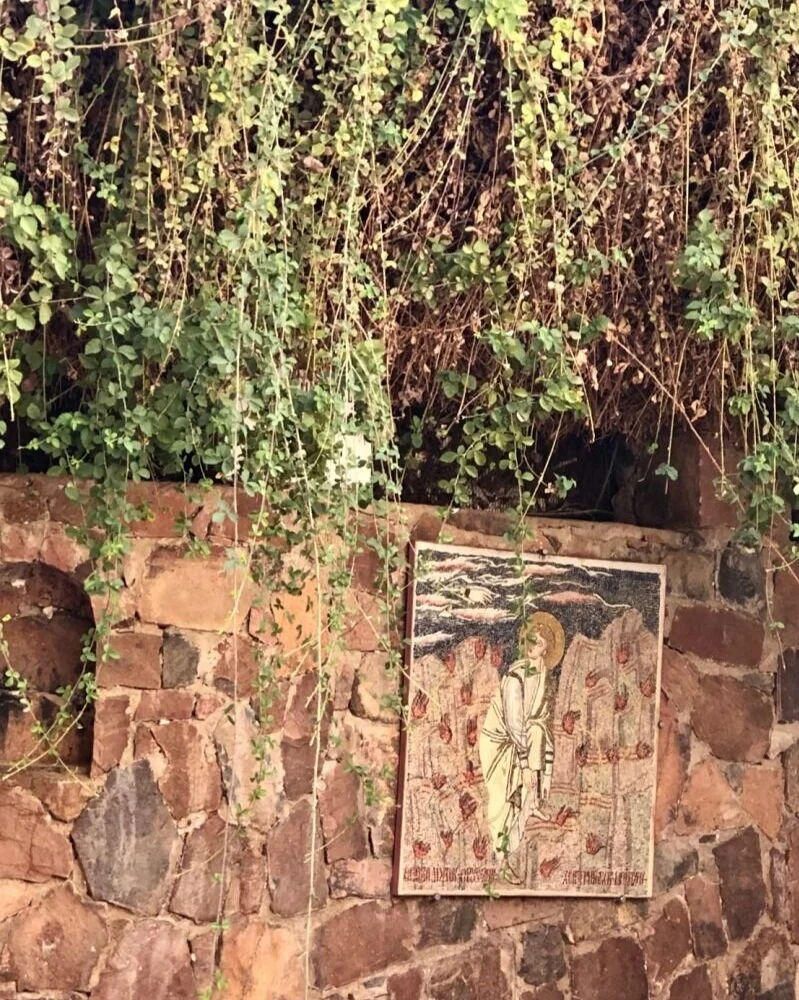 Lorsque l’on parcours le dernier kilomètre a pieds sur ce sol rocailleux lissé par le temps et les pas des pèlerins il est aisé de sentir l’histoire écrite sous nos pas. A droite du chemin un jardin d ´eden. Des arbres fruitiers, des plantes odorantes et puis des serres. A l’intérieur de ces serres poussent 26 plantes. Elles sont uniques au monde. Plantes médicinales transmises au fil des millénaires aux 24 moines résidents et gardiens du Monastère.